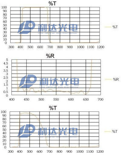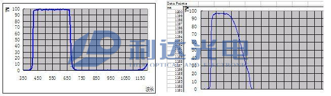 T=50%位置 短波側(cè)390(+10,-15)nm 長(zhǎng)波側(cè)640(+15,-10)nm